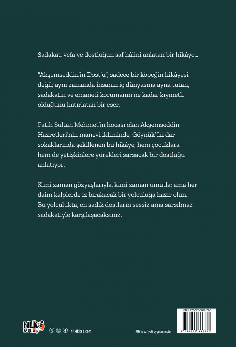 “Akşemseddin’in Dost’u”, sadece bir köpeğin hikâyesi değil; aynı zamanda insanın iç dünyasına ayna tutan, sadakatin ve emaneti korumanın ne kadar kıymetli olduğunu hatırlatan bir eser. Fatih Sultan Mehmet’in hocası olan Akşemseddin Hazretleri’nin manevi ikliminde, Göynük’ün dar sokaklarında şekillenen bu hikâye; hem çocuklara hem de yetişkinlere yürekleri sarsacak bir dostluğu anlatıyor.