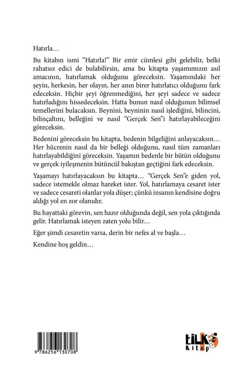 Bu kitabın ismi “Hatırla!” Bir emir cümlesi gibi gelebilir, belki rahatsız edici de bulabilirsin, ama bu kitapta yaşamımızın asıl amacının, hatırlamak olduğunu göreceksin. Yaşamındaki her şeyin, herkesin, her olayın, her anın birer hatırlatıcı olduğunu fark edeceksin. Hiçbir şeyi öğrenmediğini, her şeyi sadece ve sadece hatırladığını hissedeceksin. Hatta bunun nasıl olduğunun bilimsel temellerini bulacaksın. Beynini, beyninin nasıl işlediğini, bilincini, bilinçaltını, belleğini ve nasıl “Gerçek Sen”i hatırlayabileceğini göreceksin.