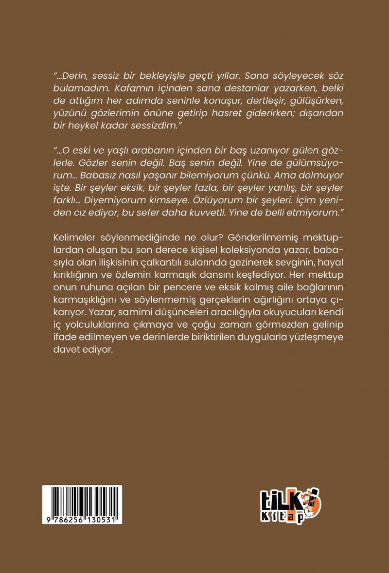 Kelimeler söylenmediğinde ne olur? Gönderilmemiş mektuplardan oluşan bu son derece kişisel koleksiyonda yazar, babasıyla olan ilişkisinin çalkantılı sularında gezinerek sevginin, hayal kırıklığının ve özlemin karmaşık dansını keşfediyor. Her mektup onun ruhuna açılan bir pencere ve eksik kalmış aile bağlarının karmaşıklığını ve söylenmemiş gerçeklerin ağırlığını ortaya çıkarıyor. Yazar, samimi düşünceleri aracılığıyla okuyucuları kendi iç yolculuklarına çıkmaya ve çoğu zaman görmezden gelinip ifade edilmeyen ve derinlerde biriktirilen duygularla yüzleşmeye davet ediyor.