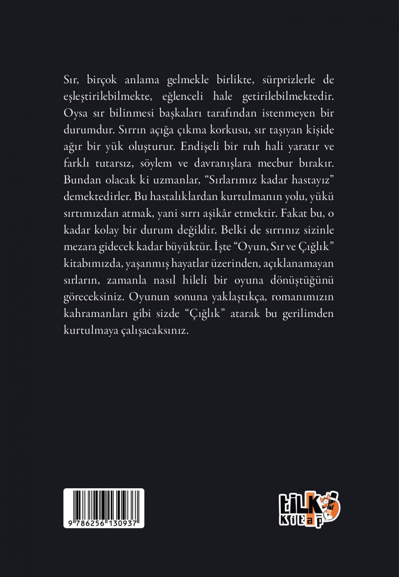 Sır, birçok anlama gelmekle birlikte, sürprizlerle de eşleştirilebilmekte, eğlenceli hale getirilebilmektedir. Oysa sır bilinmesi başkaları tarafından istenmeyen bir durumdur. Sırrın açığa çıkma korkusu, sır taşıyan kişide ağır bir yük oluşturur. Endişeli bir ruh hali yaratır ve farklı tutarsız, söylem ve davranışlara mecbur bırakır. Bundan olacak ki uzmanlar, “Sırlarımız kadar hastayız” demektedirler. Bu hastalıklardan kurtulmanın yolu, yükü sırtımızdan atmak, yani sırrı aşikâr etmektir. Fakat bu, o kadar kolay bir durum değildir. Belki de sırrınız sizinle mezara gidecek kadar büyüktür. İşte “Oyun, Sır ve Çığlık” kitabımızda, yaşanmış hayatlar üzerinden, açıklanamayan sırların, zamanla nasıl hileli bir oyuna dönüştüğünü göreceksiniz. Oyunun sonuna yaklaştıkça, romanımızın kahramanları gibi sizde “Çığlık” atarak bu gerilimden kurtulmaya çalışacaksınız.
