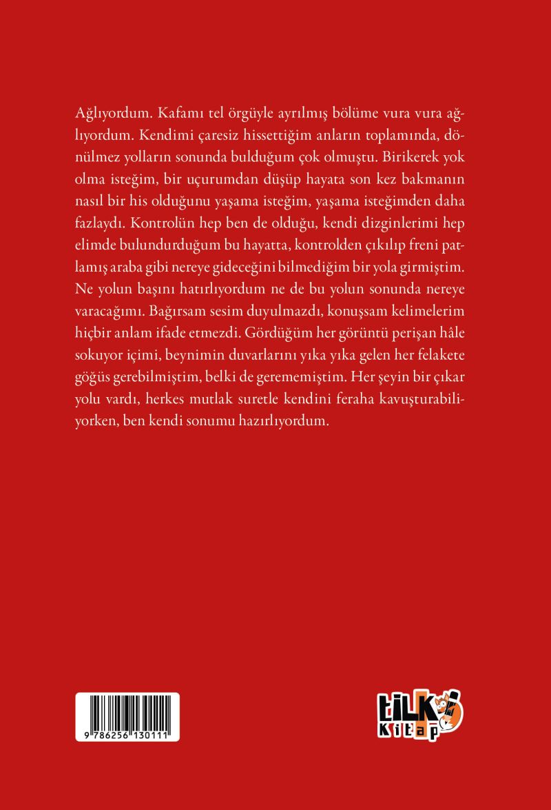 Ağlıyordum. Kafamı tel örgüyle ayrılmış bölüme vura vura ağlıyordum. Kendimi çaresiz hissttiğim anların toplamında, dönülmez yolların sonunda bulduğum çok olmuştu. Birikerek yok olma isteğim, bir uçurumdan düşüp hayata son kez bakmanın nasıl bir his olduğunu yaşama isteğim,yaşama isteğimden daha fazlaydı.Kontrolün hep ben de olduğu , kendi dizginlerimi hep elimde bulundurduğum bu hayatta kontrolden çıkarılıp freni patlamış araba gibi nereye gideceğini bilmediğim bir yola girmiştim. Ne yolun başını hatırlıyordum ne de bu yolun sonunda nereye varacağımı.Bağırsam sesim duyulmazdı, konuşsam kelimelerim hiçbir anlam ifade etmezdi.Gördüğüm her görüntü perişan hale sokuyor içimi, beynimin duvarlarını yıka yıka gelen her felakete göğüs gerebilmiştim belki de gerememiştim.Her şeyin bir çıkar yolu vardı, herkes mutlak suretle kendini feraha kavuşturabiliyorken, ben kendi sonumu hazırlıyordum.