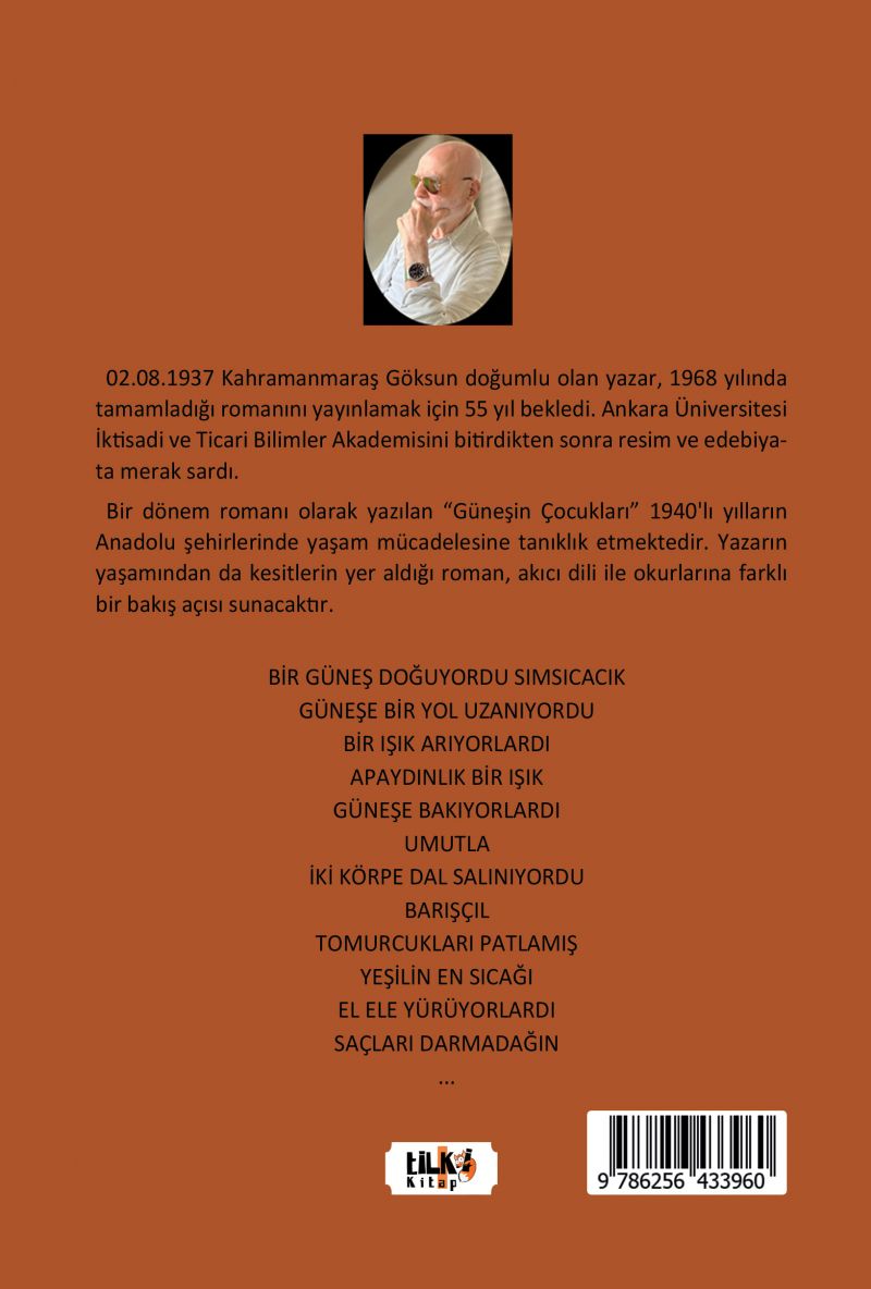 02.08.1937 Kahramanmaraş Göksun doğumlu olan yazar, 1968 yılında tamamladığı romanını yayınlamak için 55 yıl bekledi. Ankara Üniversitesi İktisadi ve Ticari Bilimler Akademisini bitirdikten sonra resim ve edebiyata merak sardı. Bir dönem romanı olarak yazılan "Güneşin Çocukları" 1940'lı yılların Anadolu şehirlerinde yaşam mücadelesine tanıklık etmektedir. Yazarın yaşamından da kesitlerin yer aldığı roman, akıcı dili ile okurlarına farklı bir bakış açısı sunacaktır.