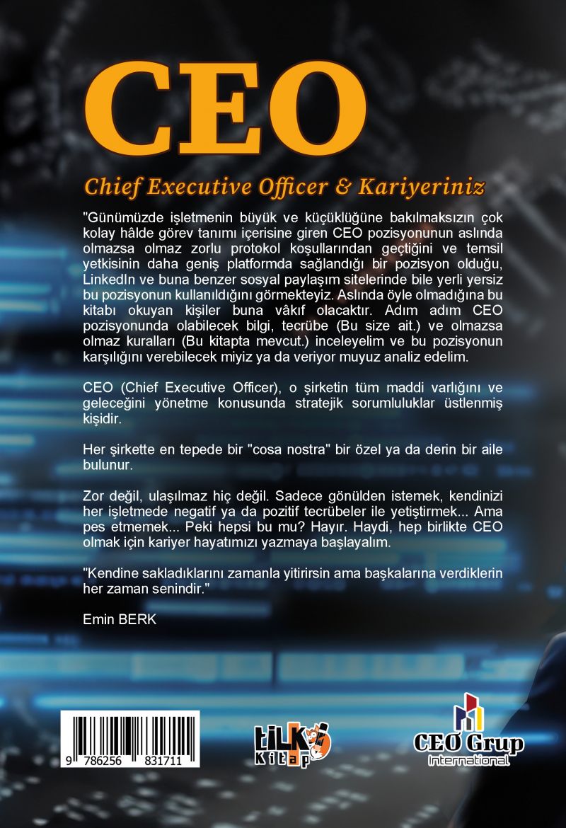 "Günümüzde işletmenin büyük ve küçüklüğüne bakılmaksızın çok kolay hâlde görev tanımı içerisine giren CEO pozisyonunun aslında olmazsa olmaz zorlu protokol koşullarından geçtiğini ve temsil yetkisinin daha geniş platformda sağlandığı bir pozisyon olduğu, LinkedIn ve buna benzer sosyal paylaşım sitelerinde bile yerli yersiz bu pozisyonun kullanıldığını görmekteyiz. Aslında öyle olmadığına bu kitabı okuyan kişiler buna vâkıf olacaktır. Adım adım CEO pozisyonunda olabilecek bilgi, tecrübe (Bu size ait.) ve olmazsa olmaz kuralları (Bu kitapta mevcut.) inceleyelim ve bu pozisyonun karşılığını verebilecek miyiz ya da veriyor muyuz analiz edelim.