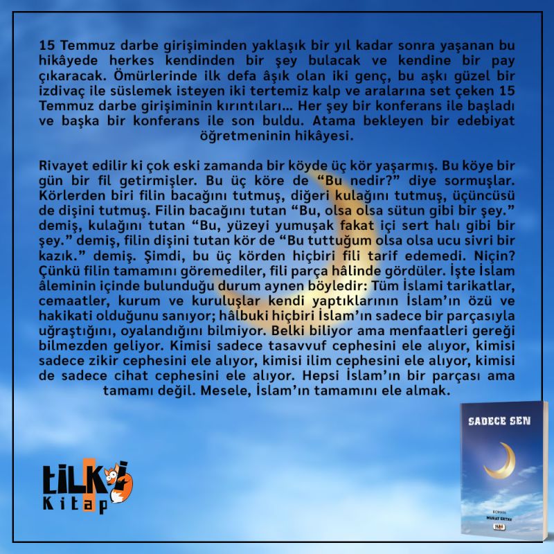 Rivayet edilir ki çok eski zamanda bir köyde üç kör yaşarmış. Bu köye bir gün bir fil getirmişler. Bu üç köre de "Bu nedir?" diye sormuşlar. Körlerden biri filin bacağını tutmuş, diğeri kulağını tutmuş, üçüncüsü de dişini tutmuş. Filin bacağını tutan "Bu, olsa olsa sütun gibi bir şey." demiş, kulağını tutan "Bu, yüzeyi yumuşak fakat içi sert halı gibi bir şey." demiş, filin dişini tutan kör de "Bu tuttuğum olsa olsa ucu sivri bir kazık." demiş. Şimdi, bu üç körden hiçbiri fili tarif edemedi. Niçin? Çünkü filin tamamını göremediler, fili parça hâlinde gördüler. İşte İslam âleminin içinde bulunduğu durum aynen böyledir: Tüm İslami tarikatlar, cemaatler, kurum ve kuruluşlar kendi yaptıklarının İslam'ın özü ve hakikati olduğunu sanıyor; hâlbuki hiçbiri İslam'ın sadece bir parçasıyla uğraştığını, oyalandığını bilmiyor. Belki biliyor ama menfaatleri gereği bilmezden geliyor. Kimisi sadece tasavvuf cephesini ele alıyor, kimisi sadece zikir cephesini ele alıyor, kimisi ilim cephesini ele alıyor, kimisi de sadece cihat cephesini ele alıyor. Hepsi İslam'ın bir parçası ama tamamı değil. Mesele, İslam'ın tamamını ele almak.