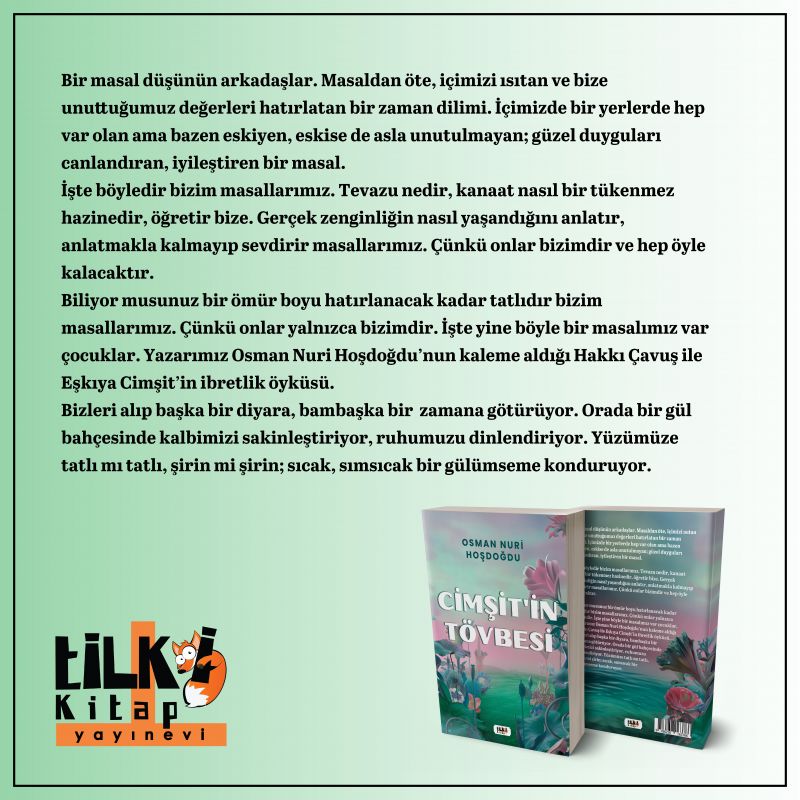 Biliyor musunuz bir ömür boyu hatırlanacak kadar tatlıdır bizim masallarımız. Çünkü onlar yalnızca bizimdir. İşte yine böyle bir masalımız var çocuklar. Yazarımız Osman Nuri Hoşdoğdu'nun kaleme aldığı Hakkı Çavuş ile Eşkıya Cimşit'in ibretlik öyküsü. Bizleri alıp başka bir diyara, bambaşka bir zamana götürüyor. Orada bir gül bahçesinde kalbimizi sakinleştiriyor, ruhumuzu dinlendiriyor. Yüzümüze tatlı mı tatlı, şirin mi şirin; sıcak, sımsıcak bir gülümseme konduruyor.