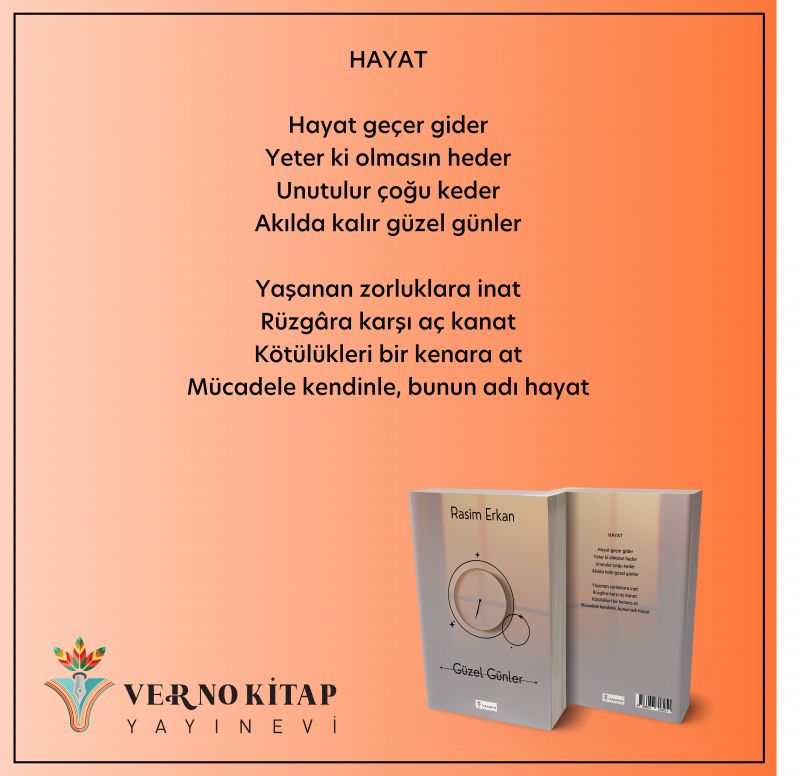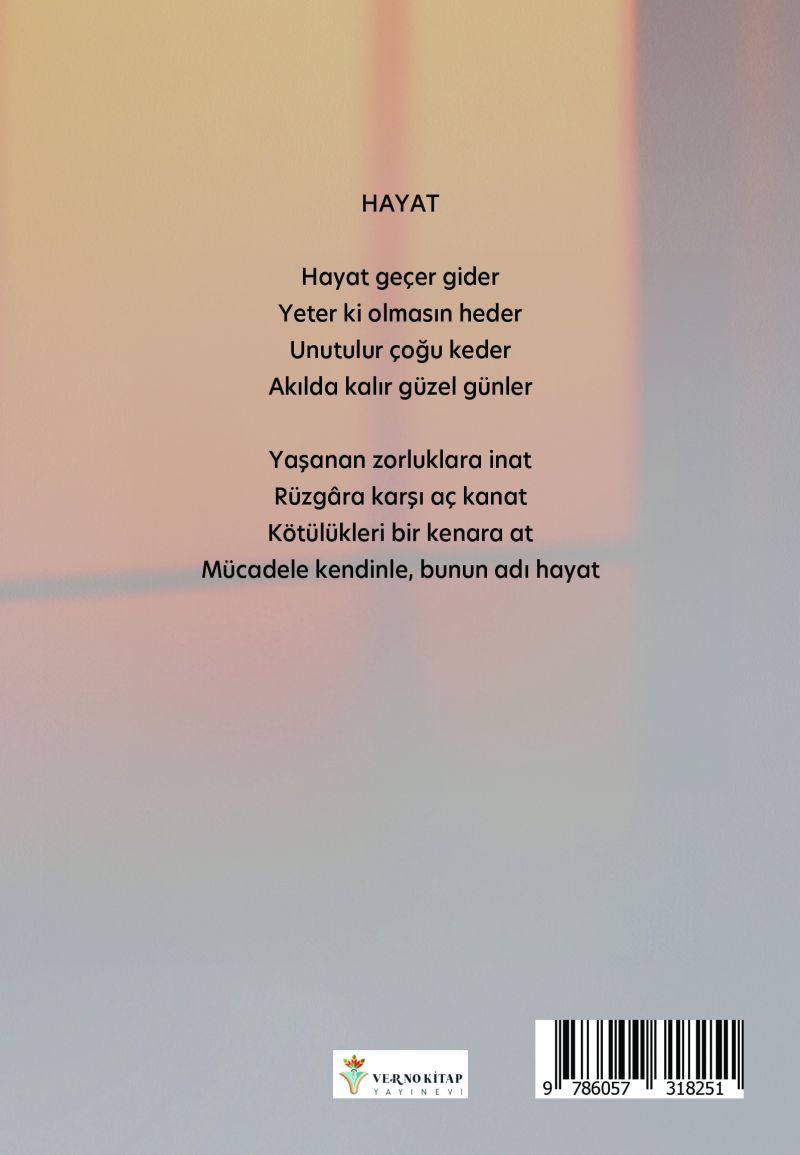 HAYAT Hayat geçer gider Yeter ki olmasın heder Unutulur çoğu keder Akılda kalır güzel günler Yaşanan zorluklara inat Rüzgâra karşı aç kanat Kötülükleri bir kenara at Mücadele kendinle, bunun adı hayat
