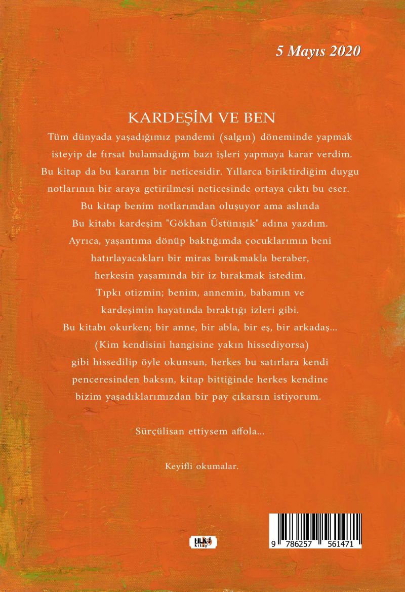 Tüm dünyada yaşadığımız pandemi (salgın) döneminde yapmak isteyip de fırsat bulamadığım bazı işleri yapmaya karar verdim. Bu kitap da bu kararın bir neticesidir. Yıllarca biriktirdiğim duygu notlarının bir araya getirilmesi neticesinde ortaya çıktı bu eser. Bu kitap benim notlarımdan oluşuyor ama aslında "Bu kitabı kardeşim "Gökhan Üstünışık" adına yazdım. Ayrıca, yaşantıma dönüp baktığımda, çocuklarımın beni hatırlayacakları bir miras bırakmakla beraber, herkesin yaşamında bir iz bırakmak istedim. Tıpkı otizmin benim, annemin, babamın ve kardeşimin hayatında bıraktığı izleri gibi.