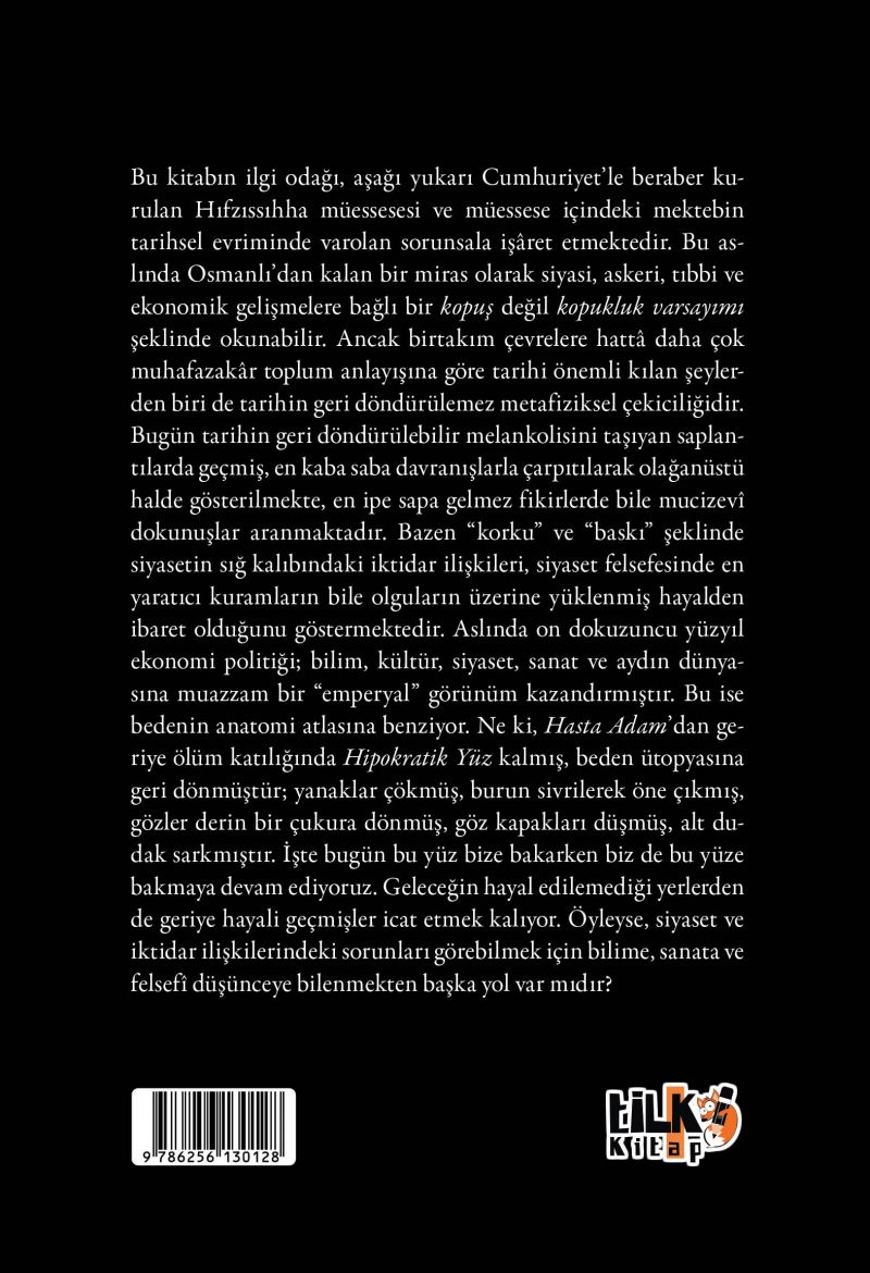 .Bu kitabı ilgi odağı, aşağı yukarı Cumhuriyet'le beraber kurulan Hıfzıssıhha müessesi ve müessese içindeki mektebin tarihsel evriminde varolan sorunsala işaret etmektedir.Bu aslında Osmanlı'dan kalan bir miras olarak siyasi, askeri , tıbbi ve ekonomik gelişmelere bağlı bir kopuş değil kopukluk varsayımı şeklinde okunabilir.Ancak bir takım çevrelere hatta daha çok muhafazakar toplum anlayışına göre tarihi önemli kılan şeylerden biri de tarihin geri döndürülebilir melankolisini taşıyan saplantılarda geçmiş , en kaba saba davranışlarla çarpıtılarak olağanüstü halde gösterilmekte , en ipe sapa gelmez fikirlerde bile mucizevi dokunuşlar aranmaktadır.Bazen "korku" ve " baskı " şeklinde siyasetin sığ kalıbındaki iktidar ilişkileri , siyaset felsefesinde en yaratıcı kurumların bile olguların üzerine yüklenmiş hayalden ibaret olduğunu göstermektedir.Aslında on dokuzuncu yüzyıl ekonomi politiği ; bilim , sanat ve aydın dünyasına muazzam bir " emperyal " görünüm kazandırmıştır.Bu ise bedenin anatomi atlasına benziyor.Ne ki ,Hasta Adam'dan geriye ölüm katılığında Hipokratik Yüz kalmış , beden ütopyasına geri dönmüştür ; yanaklar çökmüş , burun sivrilerek öne çıkmış, gözler derin bir çukura dönmüş , göz kapakları düşmüş alt dudak sarkmıştır.İşte bugün bu yüz bize bakarken biz de bu yüze bakmaya devam ediyoruz.Geleceğin hayal edilemediği yerlerden de geriye hayali geçmişler icat etmek kalıyor.Öyleyse siyaset ve iktidar ilişkilerinde ki sorunları görebilmek için bilime , sanata ve felsefi düşünceye bilenmekten başka yol var mıdır ?