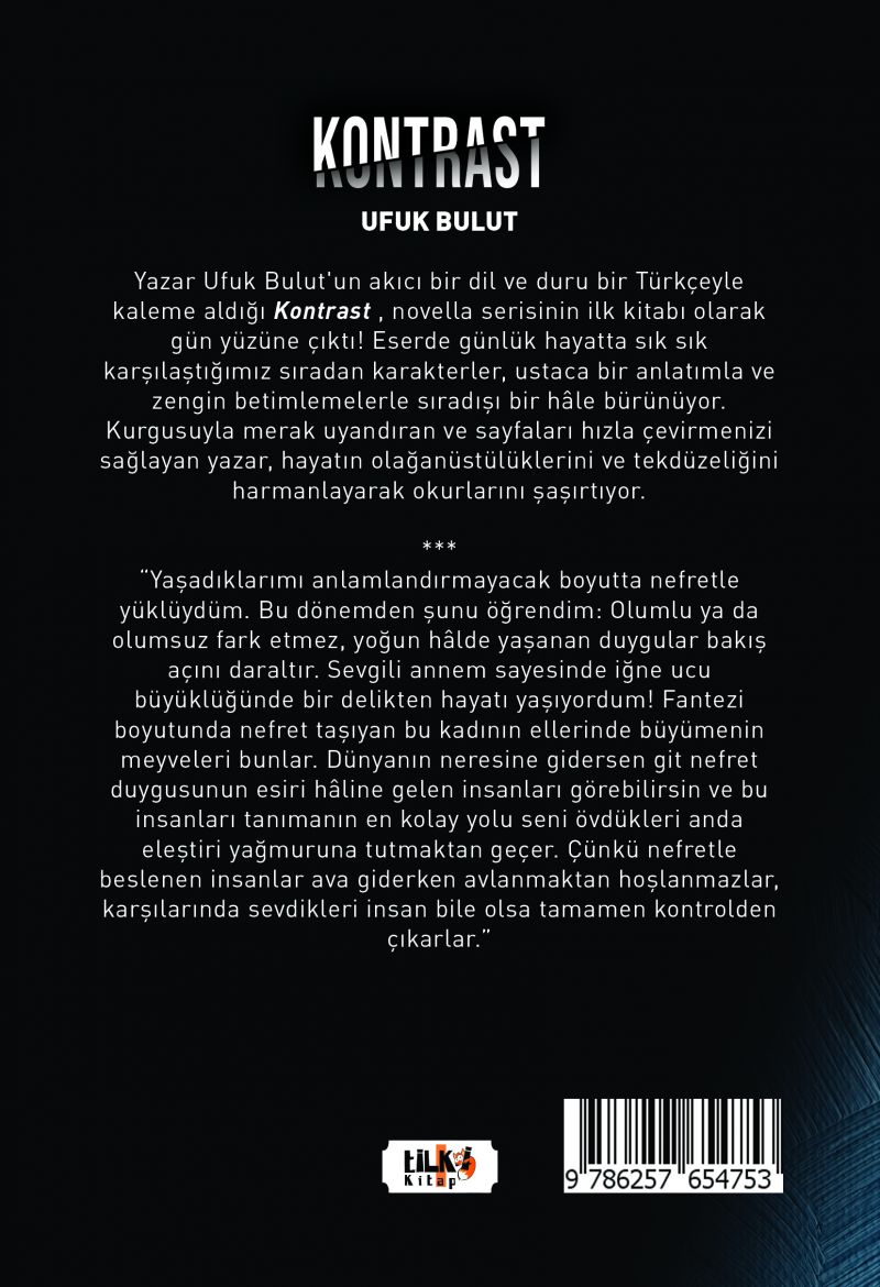 Yazar Ufuk Bulut'un akıcı bir dil ve duru bir Türkçeyle kaleme aldığı Kontrast , novella serisinin ilk kitabı olarak gün yüzüne çıktı! Eserde günlük hayatta sık sık karşılaştığımız sıradan karakterler, ustaca bir anlatımla ve zengin betimlemelerle sıradışı bir hâle bürünüyor. Kurgusuyla merak uyandıran ve sayfaları hızla çevirmenizi sağlayan yazar, hayatın olağanüstülüklerini ve tekdüzeliğini harmanlayarak okurlarını şaşırtıyor.