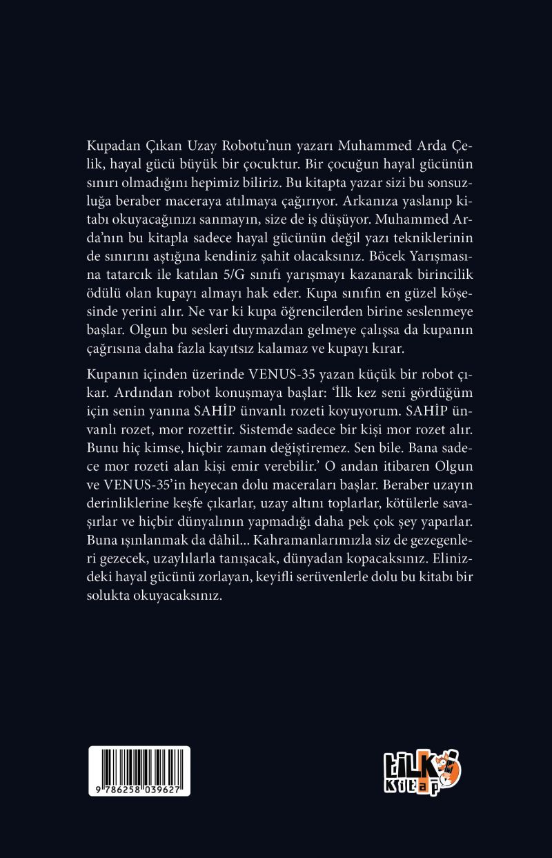 Kupadan Çıkan Uzay Robotu'nun yazarı Muhammed Arda Çelik, hayal gücü büyük bir çocuktur. Bir çocuğun hayal gücünün sınırı olmadığını hepimiz biliriz. Bu kitapta yazar sizi bu sonsuzluğa beraber maceraya atılmaya çağırıyor. Arkanıza yaslanıp kitabı okuyacağınızı sanmayın, size de iş düşüyor. Muhammed Arda'nın bu kitapla sadece hayal gücünün değil yazı tekniklerinin de sınırını aştığına kendiniz şahit olacaksınız. Böcek Yarışmasına tatarcık ile katılan 5/G sınıfı yarışmayı kazanarak birincilik ödülü olan kupayı almayı hak eder. Kupa sınıfın en güzel köşesinde yerini alır. Ne var ki kupa öğrencilerden birine seslenmeye başlar. Olgun bu sesleri duymazdan gelmeye çalışsa da kupanın çağrısına daha fazla kayıtsız kalamaz ve kupayı kırar. Kupanın içinden üzerinde VENUS-35 yazan küçük bir robot çıkar. Ardından robot konuşmaya başlar: 'İlk kez seni gördüğüm için senin yanına SAHİP ünvanlı rozeti koyuyorum. SAHİP ünvanlı rozet, mor rozettir. Sistemde sadece bir kişi mor rozet alır. Bunu hiç kimse, hiçbir zaman değiştiremez. Sen bile. Bana sadece mor rozeti alan kişi emir verebilir.' O andan itibaren Olgun ve VENUS-35'in heyecan dolu maceraları başlar. Beraber uzayın derinliklerine keşfe çıkarlar, uzay altını toplarlar, kötülerle savaşırlar ve hiçbir dünyalının yapmadığı daha pek çok şey yaparlar. Buna ışınlanmak da dâhil... Kahramanlarımızla siz de gezegenleri gezecek, uzaylılarla tanışacak, dünyadan kopacaksınız. Elinizdeki hayal gücünü zorlayan, keyifli serüvenlerle dolu bu kitabı bir solukta okuyacaksınız.