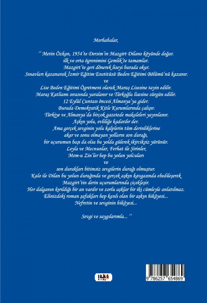 Merhabalar, ' Metin Özkan, 1954'te Dersim'in Mazgirt Dilano köyünde doğar. ilk ve orta ögrenimini Gemlik'te tamamlar. Mazgirt'te geri dönerek liseyi burada okur. Sınavları kazanarak İzmir Eğitim Enstitüsü Beden Eğitimi Bölümü'nü kazanır. ve Lise Beden Eğitimi Ögretmeni olarak Maraş Lisesine tayin edilir. Maraş Katliamı sırasında yaralanır ve Türkoğlu lisesine sürgün edilir. 12 Eylül Cuntası öncesi Almanya'ya gider. Burada Demokratik Kitle Kurumlarında çalışır. Türkiye ve Almanya'da birçok gazetede makaleleri yayınlanır. Aşkın yolu, evliliğe kadardır der ama gerçek sevginin yolu kalplerin tüm derinliklerine akar ve sonu olmayan yolların son durağı, bir uçurumun başı da olsa bu yolda gülerek ikirciksiz yürünür. Leyla ve Mecnunlar, Ferhat ile Şirinler, Mem-u Zin'ler hep bu yolun yolcuları ve son durakları bitimsiz sevgilerin durağı olmuştur. Kalo ile Dilan bu yolun durağında ve gerçek aşkın kavgasında ebedileşerek Mazgirt'tin derin uçurumlarında çiçekleşir. Her dalganın kırıldığı bir an vardır ve zorlu aşklar bir iki cümleyle anlatılmaz. Elinizdeki roman şafakları hep kanlı olan bir aşkın hikâyesi... Nefretin ve sevginin hikâyesi... Sevgi ve saygılarımla... '