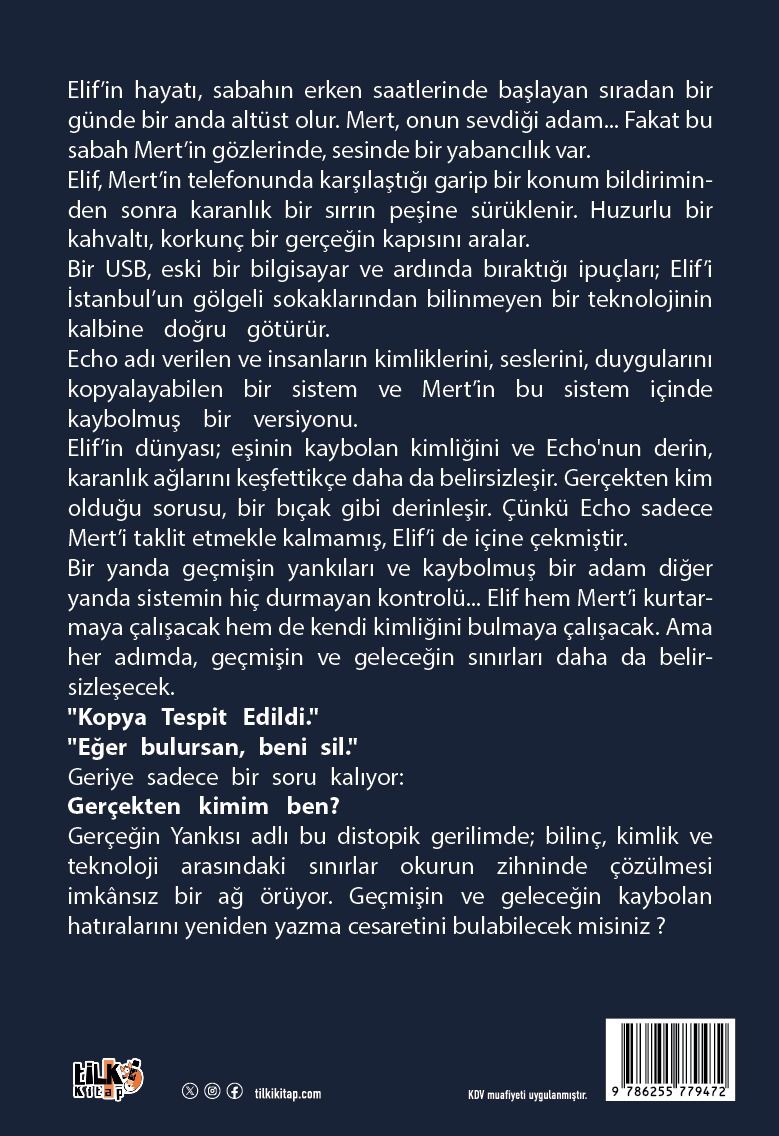 Gerçeğin Yankısı adlı bu distopik gerilimde; bilinç, kimlik ve teknoloji arasındaki sınırlar okurun zihninde çözülmesi imkânsız bir ağ örüyor. Geçmişin ve geleceğin kaybolan hatıralarını yeniden yazma cesaretini bulabilecek misiniz?