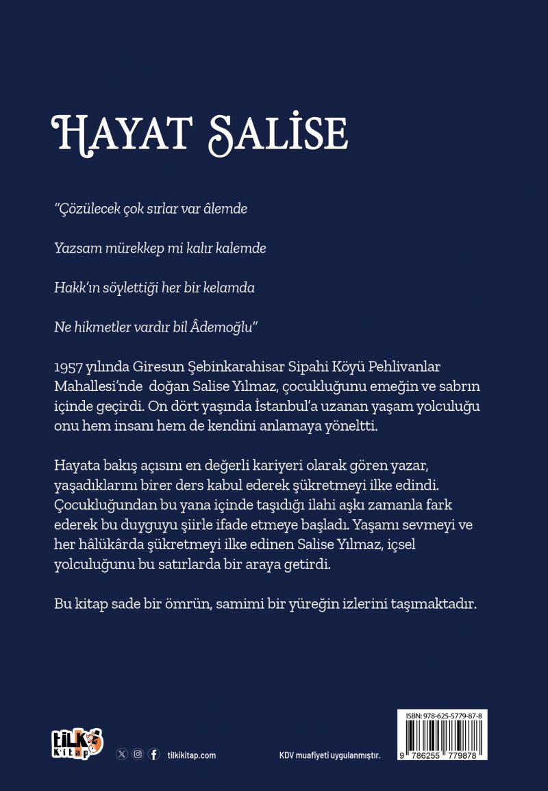 Hayata bakış açısını en değerli kariyeri olarak gören yazar, yaşadıklarını birer ders kabul ederek şükretmeyi ilke edindi. Çocukluğundan bu yana içinde taşıdığı ilahi aşkı zamanla fark ederek bu duyguyu şiirle ifade etmeye başladı. Yaşamı sevmeyi ve her hâlükârda şükretmeyi ilke edinen Salise Yılmaz, içsel yolculuğunu bu satırlarda bir araya getirdi.